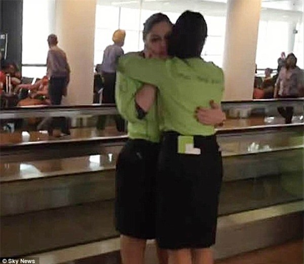 Hai nhân viên sân bay vui mừng ôm lấy sau khi thoát nạn.