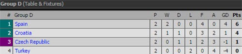 Sau 2 lượt trận đầu tiên ở bảng D, Tây Ban Nha đã chính thức có tấm vé vào chơi ở vòng 1/8 EURO 2016. Tuy nhiên, đội bóng xứ sở bò tót vẫn cần thêm 1 điểm trước Croatia để có được vị trí nhất bảng.