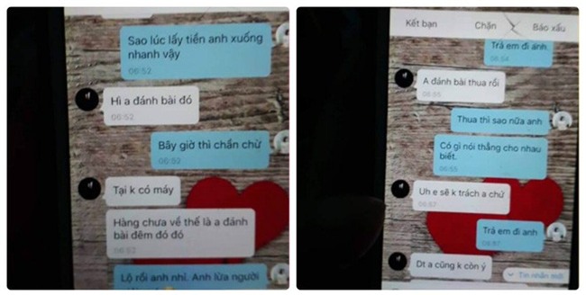 Đi kèm với bài "tố" là những đoạn tin nhắn trao đổi qua lại giữa hai người. Bạn trai cũ của cô gái thẳng thắn cho rằng vì chưa có hàng về nên lỡ tay đánh bạc hết sạch, giờ không có tiền nên bảo cô dùng tạm điện thoại cũ của anh ta.