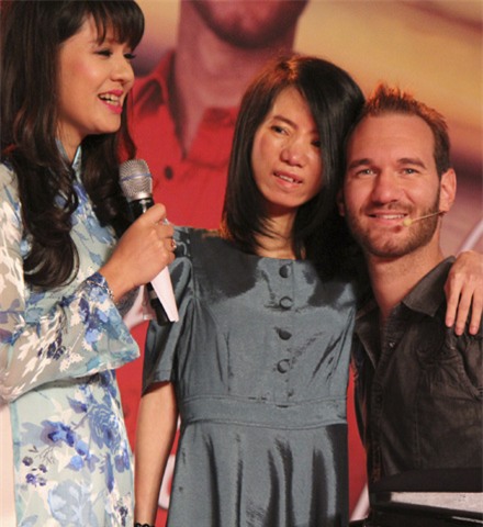 Giây phút gặp gỡ xúc động giữa Nick Vujicic và dịch giả Bích Lan. Ảnh: vũ thịnh |