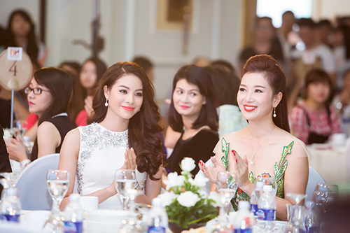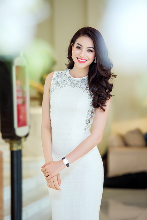 Hoa hậu chọn bộ đầm trắng bó sát khá kín đáo, nhưng vẫn khoe được nét gợi cảm khi xuất hiện trong một sự kiện diễn ra tại Hà Nội.