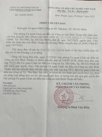 Phiếu chuyển đơn của Công an tỉnh Bình Thuận cho Công an TP Thủ Đức, TP.HCM. Ảnh: Lê Trai.