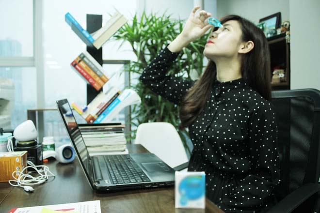 Thực tế, môi trường công sở đòi hỏi các nhân viên phải làm việc thường xuyên với máy tính, đồng nghĩa phải tiếp xúc ánh sáng xanh điện tử trong vòng 5-8 tiếng/ngày. Trong khoảng thời gian này, họ cũng thường làm việc ở trạng thái tập trung cao độ, tầm nhìn hạn chế, điểm nhìn bó hẹp, đặc biệt là bị giảm số lần chớp mắt khiến hoạt động tiết nước mắt không được diễn ra theo nhịp độ cần thiết. Hệ quả là mắt bị khô và nhức mỏi.