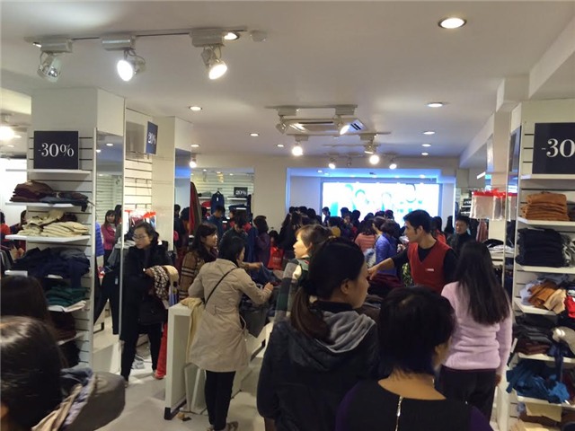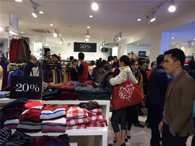 Tại các trung tâm thương mại lớn của Hà Nội như Vincom, The Garden, Parkson,... hay nhiều cửa hàng thời trang trên khắp các tuyến phố đều treo băng rôn thông báo chương trình ưu đãi, với mức giảm giá khủng khiến lượng người đổ về các cửa hàng thời trang mỗi lúc một đông.