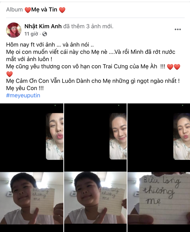 "Hôm nay Facetime với ảnh, và ảnh nói 'mẹ ơi con muốn viết cái này cho mẹ nè'. Và rồi mình đã rớt nước mắt với ảnh luôn! Mẹ cũng yêu thương con vô hạn, con trai cưng của mẹ à. Mẹ cảm ơn con vẫn luôn dành cho mẹ những gì ngọt ngào nhất. Mẹ yêu con"- Nhật Kim Anh trải lòng. Dưới phần bình luận, nhiều khán giả dành lời khen cho bé Tin, mong nhóc tỳ và mẹ sớm được đoàn tụ.