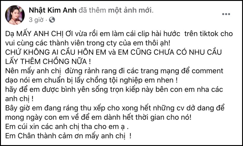 Vừa qua, Nhật Kim Anh đã có một chia sẻ gây chú ý trên trang cá nhân, liên quan đến chuyện tình cảm riêng tư của mình.