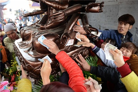 Tuy nhiên, trong một lần trả lời phỏng vấn Zing.vn, ông Vương Duy Bảo, Phó cục trưởng Cục Văn hóa cơ sở (Bộ VH-TT&DL) đã cho rằng việc mang tiền giắt vào tay tượng Phật, rải đầy dưới chân, dưới sàn là sự phỉ báng, hối lộ thánh thần. "Hiện tượng này là sự hỗn tạp bây giờ mới có. Người xưa luôn tâm niệm thần linh là một thế lực thiêng liêng của tầng trên, nên ứng xử với thần linh phải đạt được sự kính trọng và trong sáng chứ không ai ứng xử theo lối mua bán", ông Bảo khẳng định.