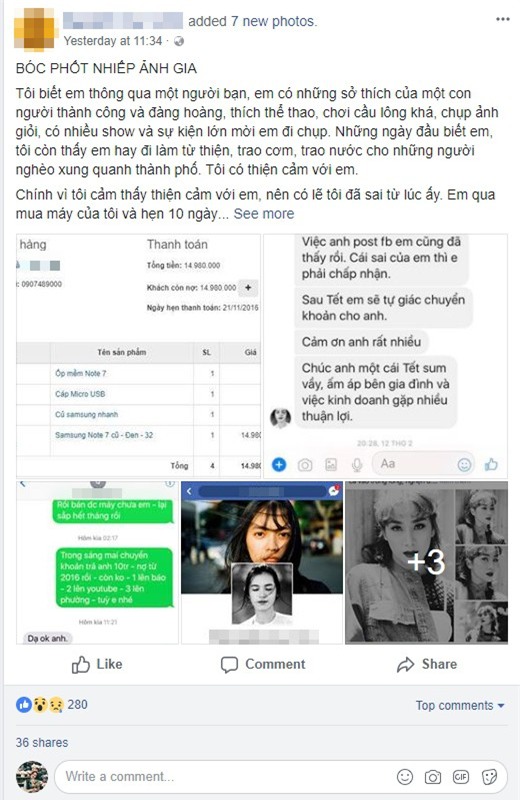 Mình không muốn dồn ép một ai đó vào đường cùng mà luôn mở một cánh cửa cho họ sửa sai, thế nhưng đến thời điểm này mình cảm thấy đã sai lầm khi làm vậy, nếu còn im lặng rất nhiều người sẽ bị giống như mình. Chia sẻ anh em trong nghề biết về bản chất con người này mà có cách phòng tránh" - anh T.P chia sẻ trên FB.