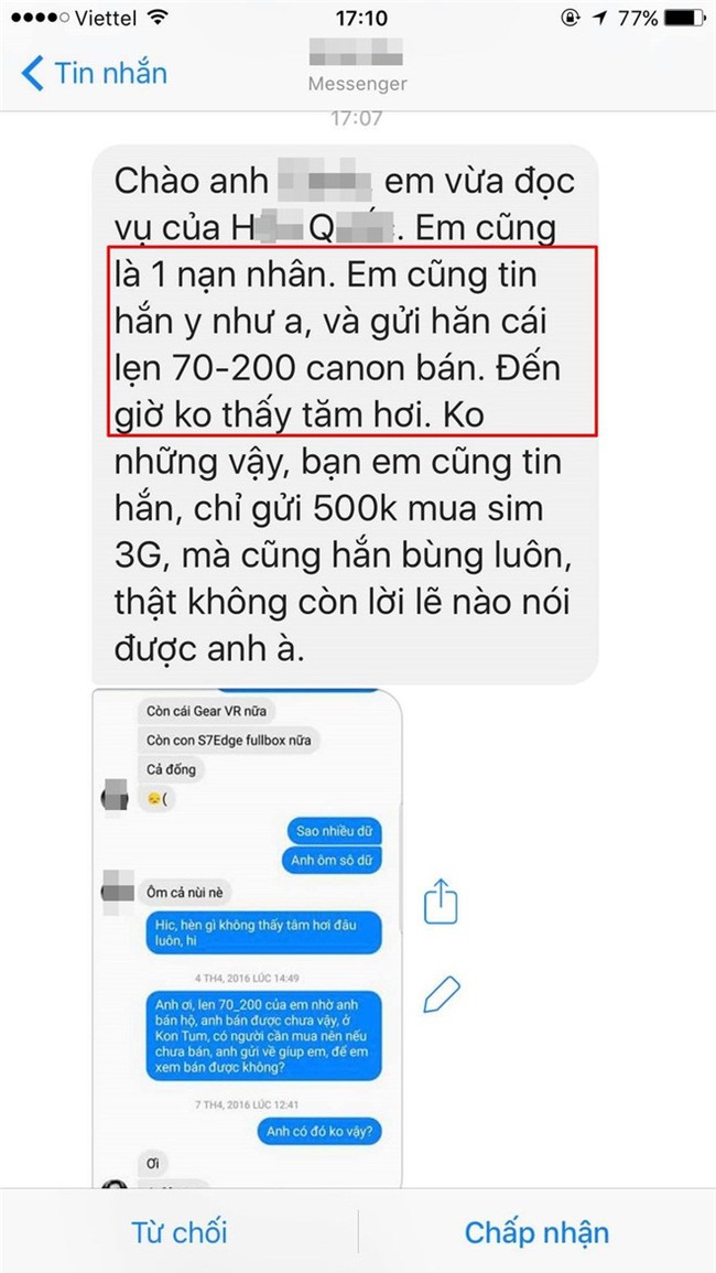 Anh N.H.C không phải nạn nhân duy nhất!Anh N.H.C cho biết, sau khi đăng bài "bóc phốt" nhiếp ảnh gia H.Q thì anh đã ngỡ ngàng nhận ra mình không phải là nạn nhân duy nhất. Cùng với việc lợi dụng sự tin tưởng, tín nhiệm của nhiều người, H.Q đã nợ tiền của rất nhiều người khác thông qua các lần mua bán điện thoại, nước hoa, hay thậm chí là tiền đặt cọc chụp ảnh.