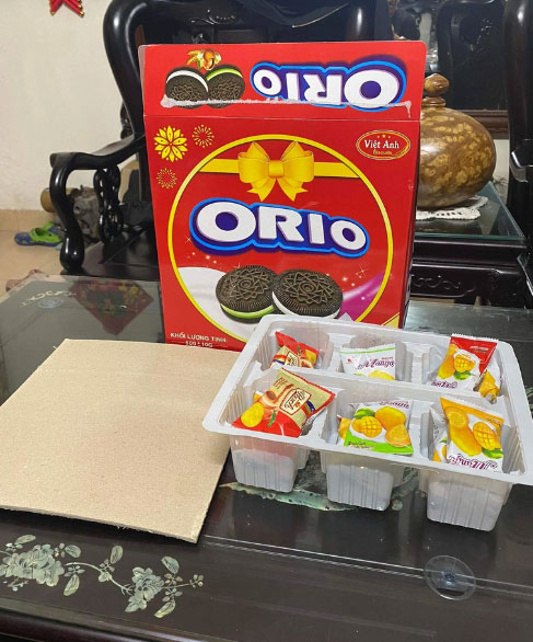 Mở ra thì đúng là "fake" 100%, bên trong là những loại bánh kẹo rẻ tiền, không rõ xuất xứ