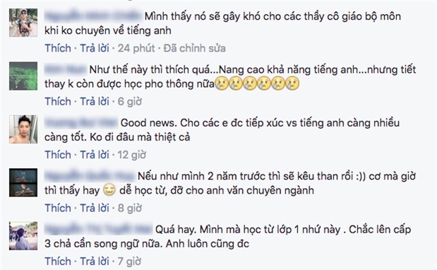 Tuy có không ít bạn tỏ ra rất bất ngờ trước thông tin có sách giáo khoa song ngữ mới vì trước đó không hề biết tới điều này, thế nhưng đa số học sinh đã thể hiện sự hào hứng, thích thú. Khá nhiều bình luận cho rằng "sách mới sẽ giúp tiếp cận tiếng Anh dễ dàng hơn", một số phấn khích hơn thì "quá tốt luôn, có thể học ké tiếng Anh nữa", "ước gì có sớm hơn"...