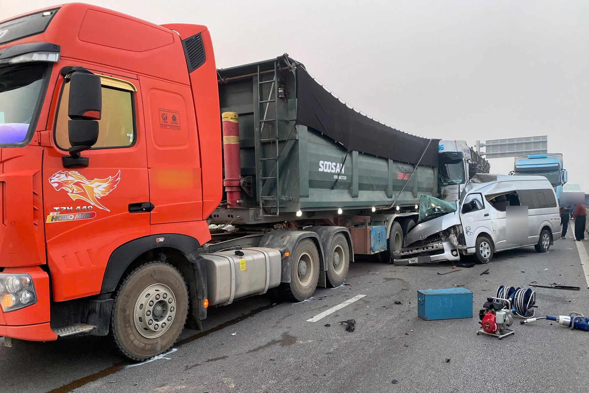 Có 3 ô tô liên quan tới vụ tai nạn liên hoàn gồm xe khách (loại 15 chỗ) biển số 38C - 229.xx (trên xe chở theo 11 hành khách); xe ô tô đầu kéo biển số 35A - 463.xx kéo theo rơ-móc biển số 35RM-005.xx và xe đầu kéo biển số 36C - 111.xx kéo rơ-móc biển số 36RM - 001.xx.