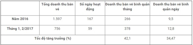 Cụ thể, tổng doanh thu bán vé trong tháng 1 và 2 năm 2017 đạt khoảng 756 tỷ đồng. Tính ra, doanh thu bán vé bình quân trong 2 tháng đầu năm đạt 378 tỷ đồng/tháng, tức tăng 42% so với trung bình tháng trong năm 2016. Tính theo bình quân ngày (59 ngày trong hai tháng đầu tiên năm 2017) đạt 12,8 tỷ đồng/ngày, tức tăng 34% so với doanh thu bán vé bình quân ngày của năm 2016.