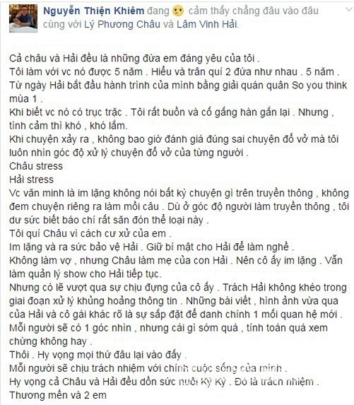 Là người thân thiết và làm việc lâu với vợ chồng Lâm Vinh Hải, stylist Nguyễn Thiện Khiêm chia sẻ về suy nghĩ của mình: "Cả châu và Hải đều là những đứa em đáng yêu của tôi. Tôi làm với vợ chồng nó được 5 năm. Hiểu và trân quí 2 đứa như nhau. 5 năm. Từ ngày Hải bắt đầu hành trình của mình bằng giải quán quân So you think mùa 1.