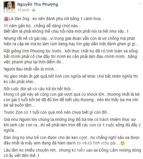 Đàn ông họ như trẻ con được cho ăn kẹo ngọt, họ chẳng nghĩ sâu sa được đâu nhất là mấy anh đang đà hám danh lợi và có tính máu gái... Lâu lắm không nhiều chuyện như thế này... Nhưng không hiểu sao lại đồng cảm những dòng cô ấy viết đến thế! Phượng nghĩ không riêng Phượng mà tất cả các mẹ bỉm sữa, single mom đều sẽ đồng cảm!".