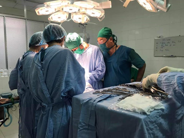 Bác sĩ Tiến (ngoài cùng bên phải) trong một ca phẫu thuật cho bệnh nhân ở khoa Ngoại 1.