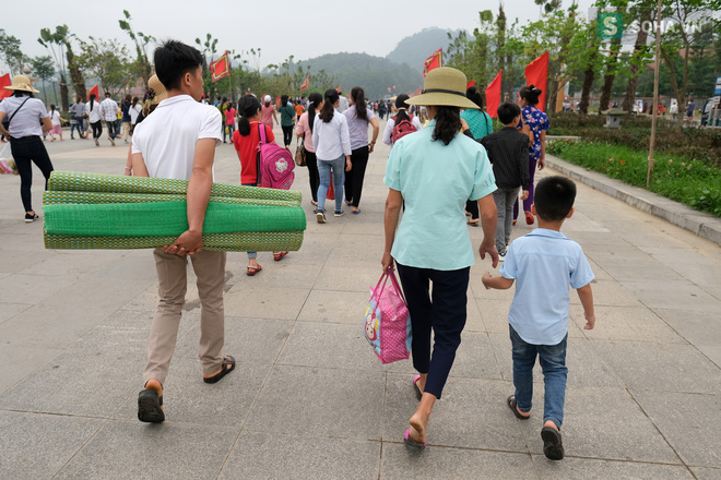 Đền Hùng năm nay khai hội đúng vào dịp cuối tuần nên lượng người đổ về hành hương tăng đột biến so với trước đó 1 - 2 ngày. Quảng trường dẫn từ cổng lớn bãi đỗ xe tới chân núi Nghiã Lĩnh trở thành một biển người tấp nập.