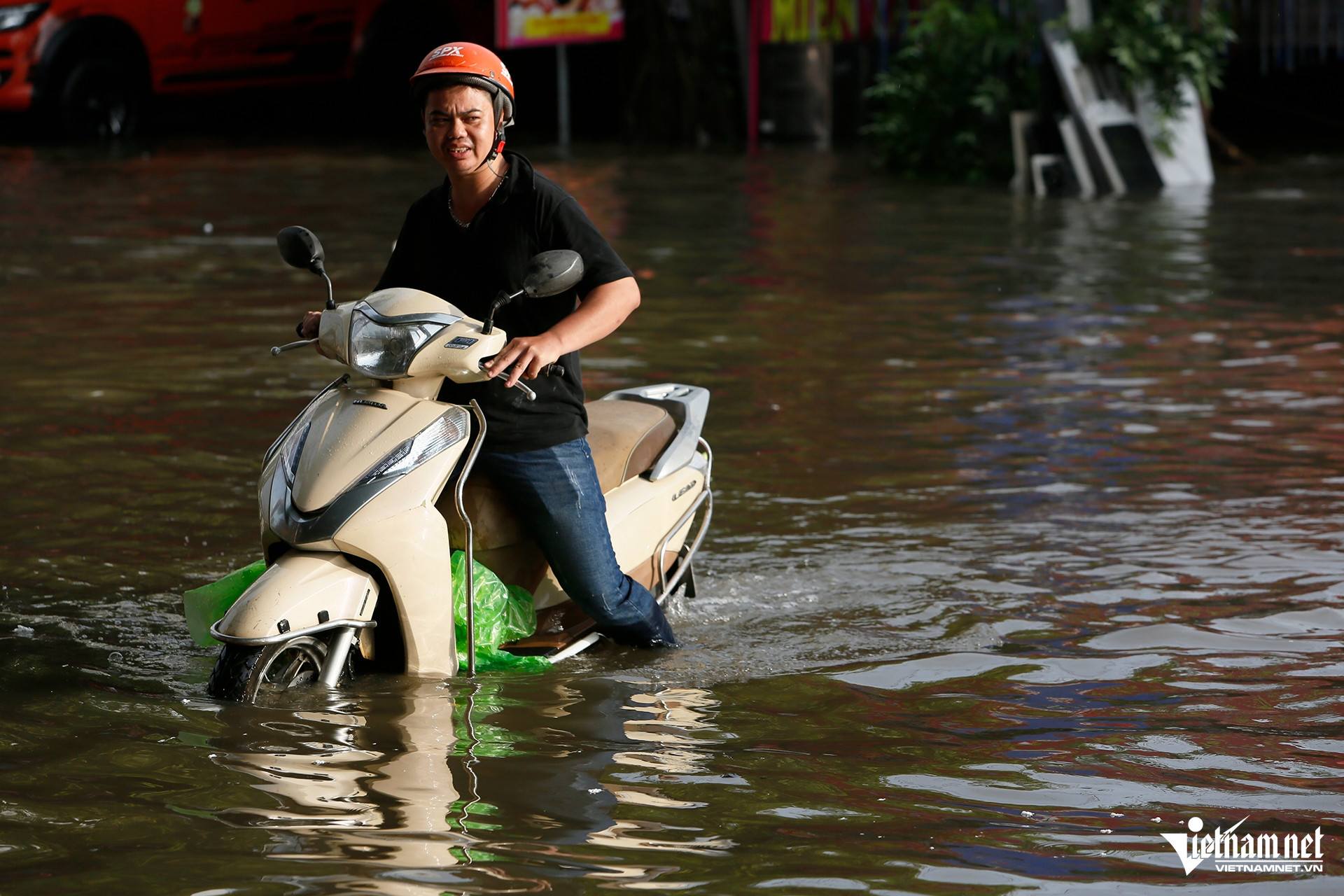 Người đàn ông cố gắng đi xe qua chỗ ngập đã phải bỏ cuộc do nước cao quá ống xả của xe.