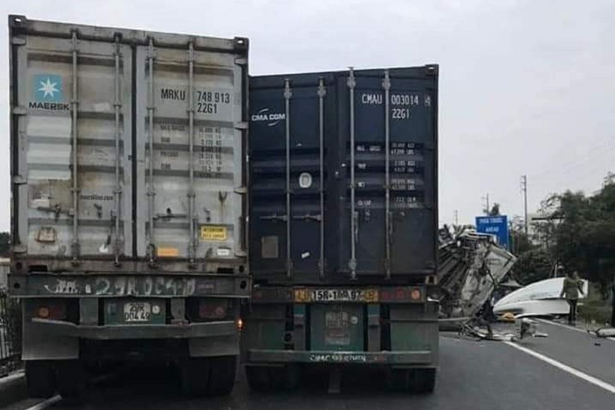 Chưa dừng lại xe container mang BKS 15C-255.80 lao qua dải phân cách va chạm tiếp với xe container BKS 29H-004.49 di chuyển theo hướng Hải Phòng - Hà Nội.