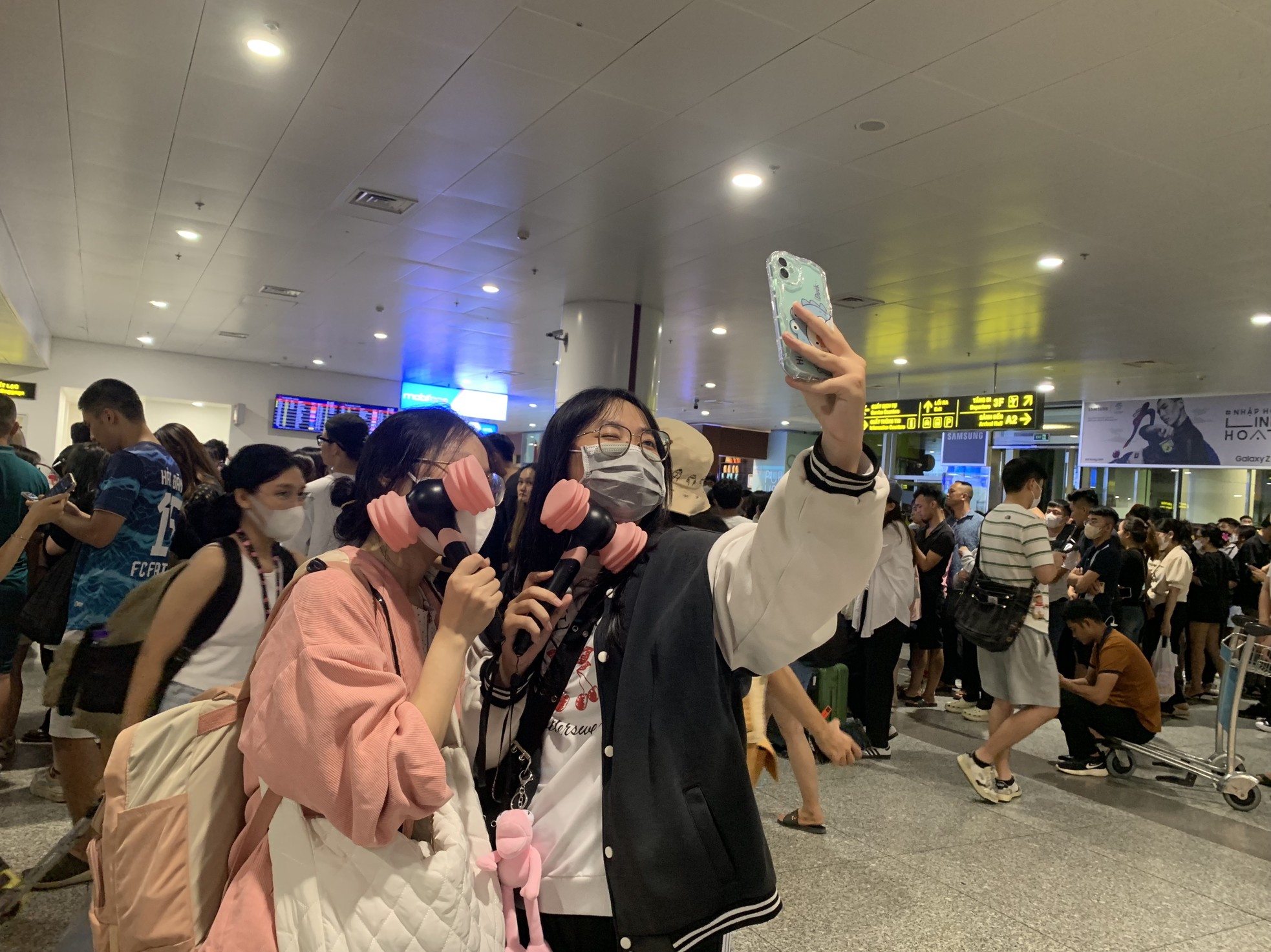 Hòa trong đám đông, hai cô gái ăn mặc thời trang, tay cầm lightstick (gậy phát sáng - PV) phấn khích cho biết đã di chuyển bằng xe máy từ nội thành lên kịp giờ để chờ đón thần tượng. Quỳnh và Dương giới thiệu đã ra trường và đi làm được một thời gian nên có thể chủ động trong việc mua vé cũng như các phụ kiện đi kèm.