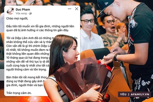 Ngày xưa, à không chính xác là 3 năm về trước: - Em là cô gái đặc biệt nhất, là tất cả mọi thứ trong cuộc đời anh. - Em là tất cả mọi thứ của anh. - Khi mình bên nhau có cãi vã, có giận hờn nhưng 1 điều anh có thể nói với em là: Anh yêu em. - Anh mãi mãi sẽ không bao giờ buông tay em ra. - Anh muốn được cùng em đi hết con đường dài phía trước và dành tất cả giây phút đời mình sau này bên em. Vân vân và mây mây… Ngày nay, cụ thể là ngày "ngọt ngào đến mấy cũng tan thành mây": "Tôi và Diệp Lâm Anh có những trục trặc trong hôn nhân không thể cứu vãn và ly thân từ tháng 1/2021… Còn vấn đề là gì thì chính Diệp Lâm Anh là người hiểu nhất…". |