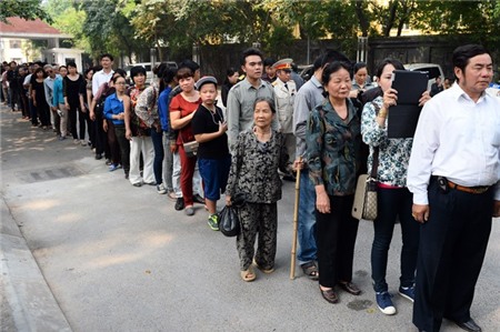 - Dòng người xếp hàng ngay ngắn nối tiếp nhau dưới thời tiết nắng thu vàng Hà Nội để tiến vào Nhà tang lễ. Ảnh: Hoàng Hà