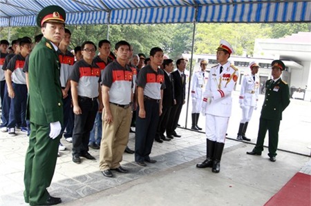 - Đoàn Thanh niên tình nguyện, sau nhiều ngày phục vụ đồng bào vào viếng vị Tướng tài ba của dân tộc, giờ đây cũng được vào cúi đầu kính cẩn trước linh cữu Đại tướng. Ảnh: Hoàng Hà