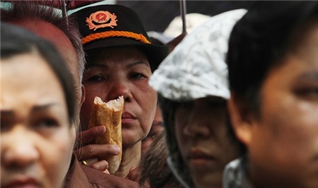 - Người trong hàng ăn vội bánh mỳ trong hàng người đứng giữa trưa nắng.