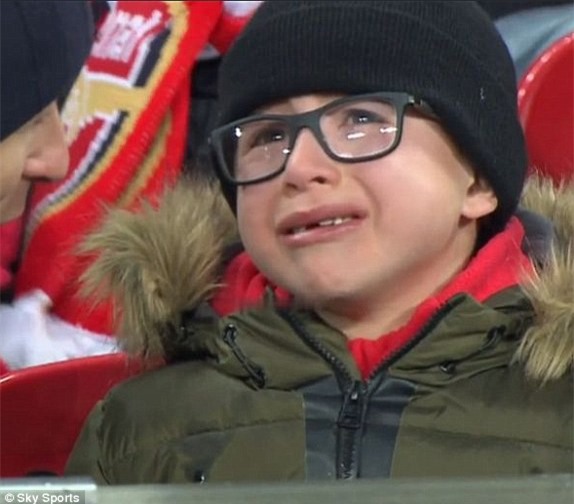 Đây là gương mặt của một CĐV nhỏ tuổi của Arsenal trên sân Wembley tối 25/2. Ống kính máy quay của đài Sky Sports bắt cận khuôn mặt mếu máo của cậu khi Arsenal để thua bàn thứ 3 trước Man City.