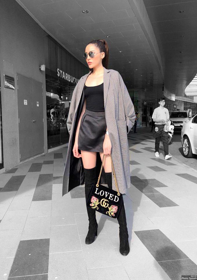 Hoa hậu sinh năm 1996 xách túi của nhà mốt đình đám Gucci. Cô kết hợp thêm đôi boots của thương hiệu Stuart Weitzman.