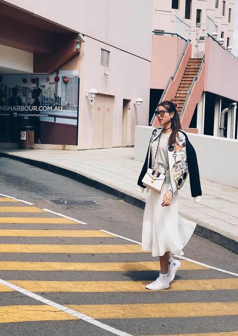 Cô lựa chọn chiếc túi xách Diorama với gam màu nhã nhặn cùng những đường thêu nổi bật với giá tiền hơn 3.000 USD (khoảng 70 triệu đồng) kết hợp cùng trang phục sang trọng của Gucci.