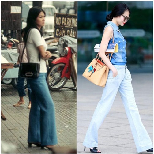 Nếu như những năm 70, thế giới rộ lên mốt quần ống loe thì đường phố Việt, đặc biệt là phố xá Sài Gòn, cũng không thiếu hình ảnh những quý cô túm năm tụm bảy trên người diện quần ống loe, áo sơ mi cổ Đức, để tóc xoăn bồng ríu rít trên phố. Đường phố Sài Gòn những năm 70, còn để lại ấn tượng bởi hình ảnh các quý cô để tóc bob, đeo bờm xinh, diện váy suông ngắn, chân đi giày kitten heel, lướt trên chiếc xe Vespa cổ kính khiến bao anh chàng phải mê mẩn.