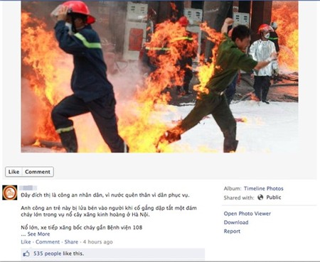 Bức ảnh một chiến sĩ bị lửa táp vào thân thể trong quá trình chữa cháy nhận được hàng trăm lượt like cùng comment của các thành viên trên một trang mạng xã hội. Hầu hết các thành viên đều bày tỏ sự yêu quý và khâm phục các chiến sĩ đang làm nhiệm vụ bất chấp sự nguy hiểm của bản thân.