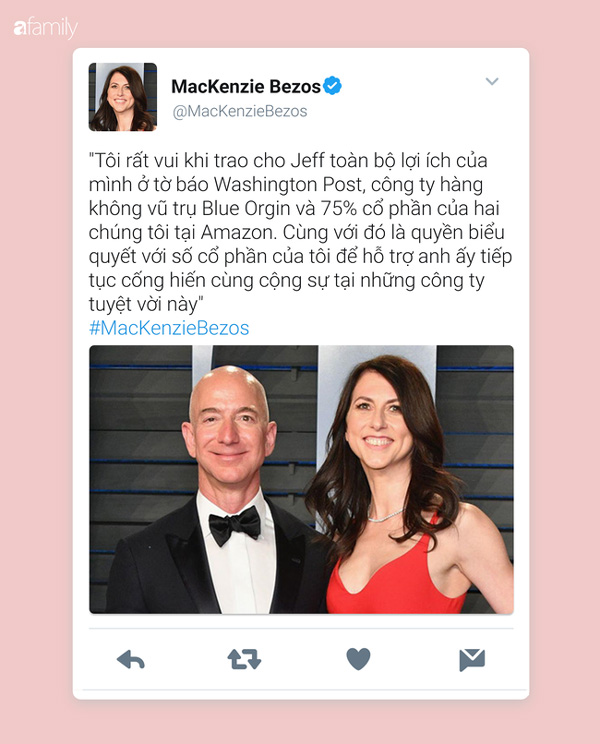 Vào ngày 5/4, bà MacKenzie đã gây bắt ngờ khi thông báo trên Twitter cá nhân của mình về việc bà cùng chồng cũ, tỷ phú Jeff Bezos đã hoàn tất xong thủ tục ly hôn.