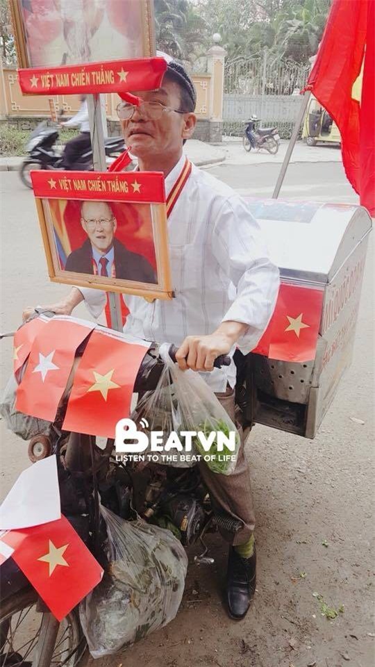 Đi bán hàng, nhưng bác trai luôn sẵn sàng tinh thần cổ vụ đội nhà!