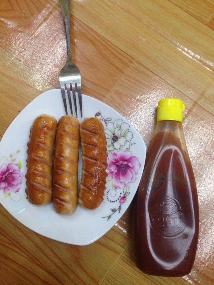 Chủ nhân của bức ảnh, N.V.Thắng viết trên facebook, "Có đứa bạn không biết nấu ăn nên khổ quá. Hôm nay bạn nấu cho món này đây. Nhìn không dám ăn. Không hiểu bạn chiên xúc xích với bột kiểu gì thành ra thế này.