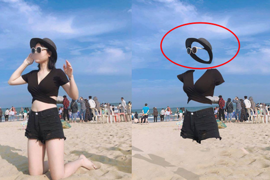Cặp đôi "quần đùi dưa hấu" nhờ chỉnh ảnh đang đứng ở biển, và cái kết...