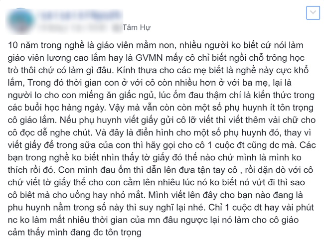 - Tôi cũng là phụ huynh nhưng tôi không bao giờ nhờ vả kiểu vô ý tứ như thế này. Giáo viên mầm non cực lắm mọi người ơi. Tất nhiên nghề nào chả có cái khổ nhưng riêng sự nghiệp trồng người cần được trân trọng đúng nghĩa. Hơn nữa con mình nhỏ cần phải nhờ cô chăm sóc thì phải nói chuyện rõ ràng, đàng hoàng chứ viết cộc lốc thế này mà chấp nhận được à?