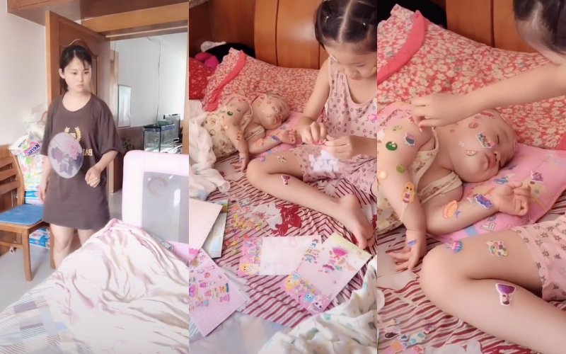 Mở đầu đoạn clip là một bà mẹ trẻ bỉm sữa có vẻ rất mệt mỏi đang bước vào phòng ngủ. Thế nhưng ngay lập tức biểu cảm trên gương mặt của chị đã vô cùng hoảng hốt. Vì sao ư? Hãy nhìn cảnh tượng trên giường ngủ khi cô chị say sưa dán những miếng dán khắp nơi trên người cậu em đang ngủ ngon lành.