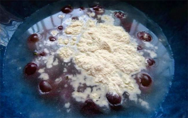 2. Nhẹ nhàng cho nho vào chậu, cho một thìa muối vào với mục đích là khử trùng, sau đó đổ 2 thìa bột mì. Bột mì là chất hấp thụ tự nhiên, có thể rửa sạch vết bẩn dám dính. Sau 3 phút bạn sẽ thấy nho sạch bong.