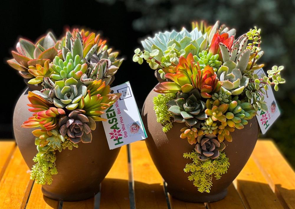 "Sen đá rất nặng và cũng khó tạo hình hơn hoa tươi nhiều. Thời gian ban đầu, tôi gặp khó khăn khi thiết kế mẫu, nhiều khi phải cắm đi cắm lại một chậu sen đá cả chục lần mới ra được sản phẩm ưng ý", chị Mỹ nói.