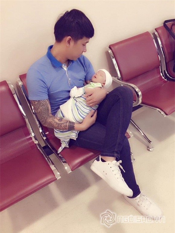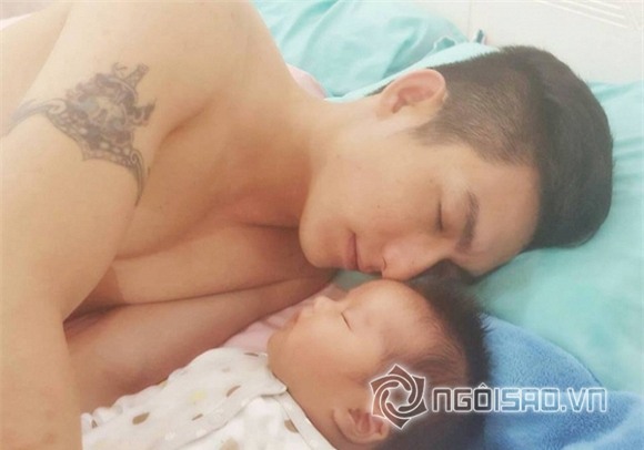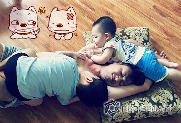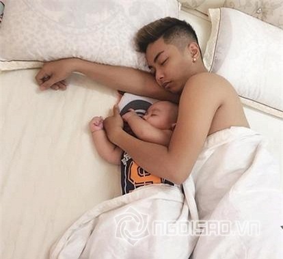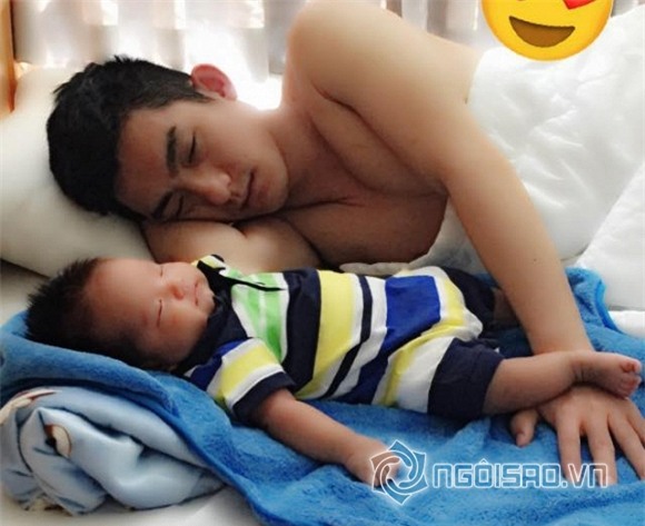 Ưng Hoàng Phúc cẩn thận để con trai nằm ngủ trên bụng