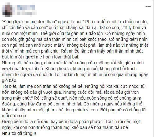 Hiện tại, dòng tâm sự nhiều xúc cảm của chị N.H vẫn nhận được sự quan tâm lớn từ hội chị em. Rất nhiều bình luận khẳng định, những điều mà bà mẹ đơn thân trải lòng đã đem đến cho người chung hoàn cảnh niềm tin và nghị lực vào tương lai phía trước.