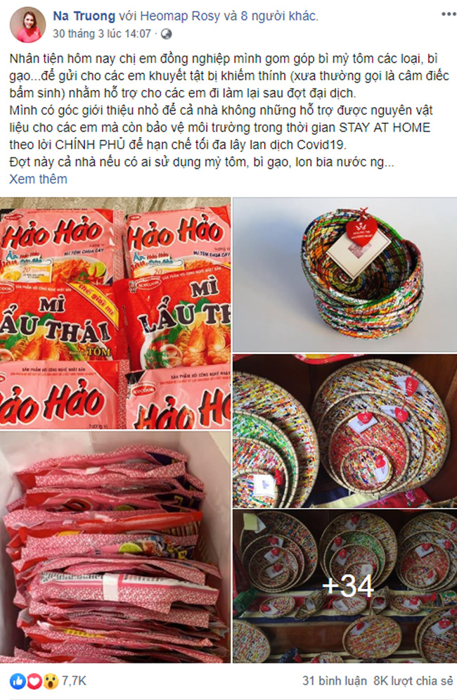 Mới đây tài khoản mạng xã hội Na Truong tại TP Huế đã đăng tải dòng trạng thái kêu gọi mọi người trong thời gian cách ly toàn xã hội trong 15 ngày giữ lại vỏ mì tôm, lon nước ngọt hoặc giấy báo cũ. Việc làm này nhằm mục đích giúp cho những người khiếm thính tại một trung tâm bán hàng lưu niệm từ những sản phẩm tái chế có nguồn nguyên liệu để phục vụ sản xuất sau thời kỳ dịch bệnh.
