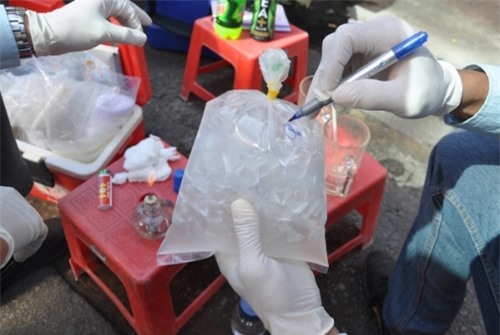 Lấy mẫu đá viên đi xét nghiệm - Ảnh: Thanh niên
