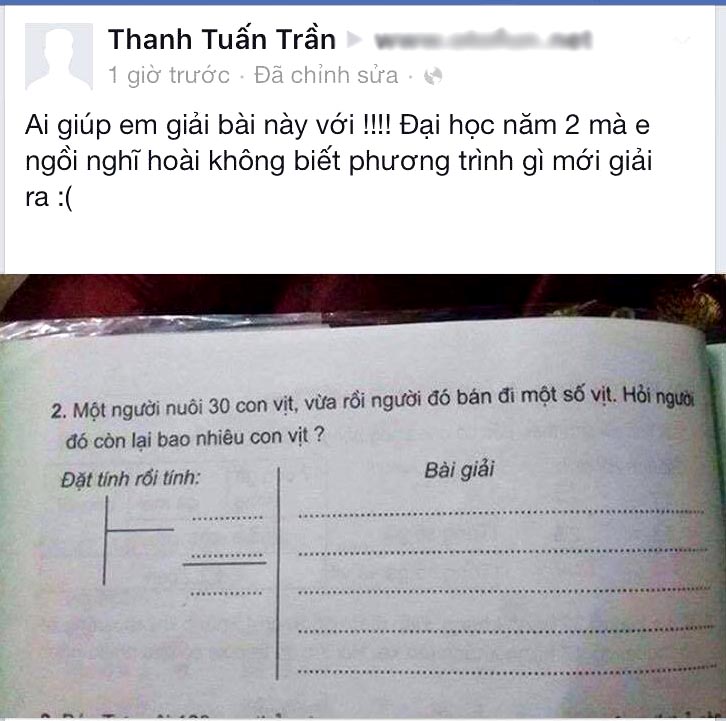 Chưa đủ mơ hồ, tác giả đề toán trên còn thêm vào đó phần đặt phép tính chia khiến cả bạn Thanh Tuấn Trần, tự xưng là sinh viên đại học năm 2 cũng không biết dùng phương trình gì để giải cho ra bài toán hóc búa này.