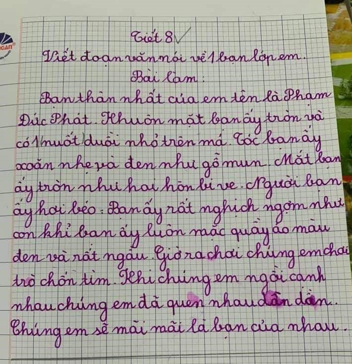 Phụ huynh Lê Bích Thảo thì cho rằng như thế này “chưa nhằm nhò” so với bài văn của con mình. “Với đề yêu cầu kể về lớp học, con viết lớp em có 25 bạn sau đó liệt kê đủ tên của 25 bạn. Và kết luận em rất yêu lớp em”.