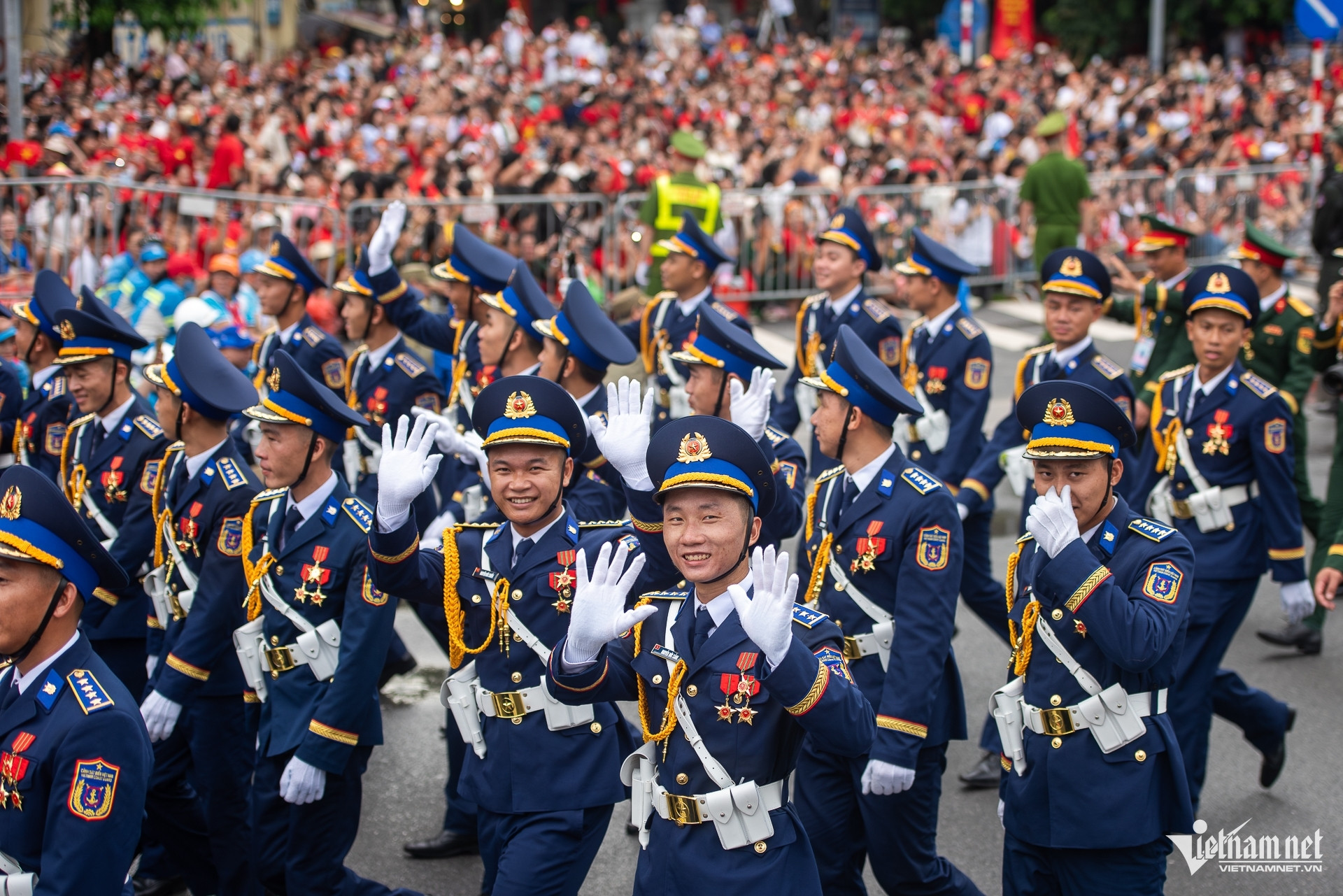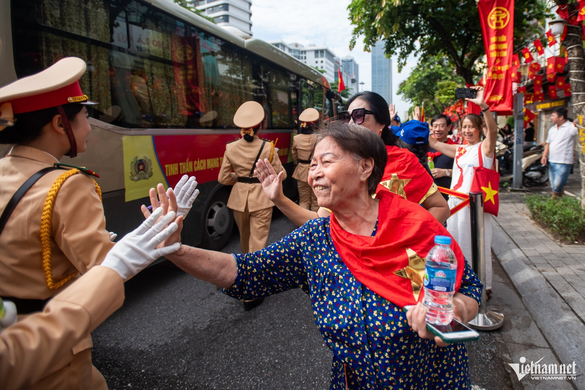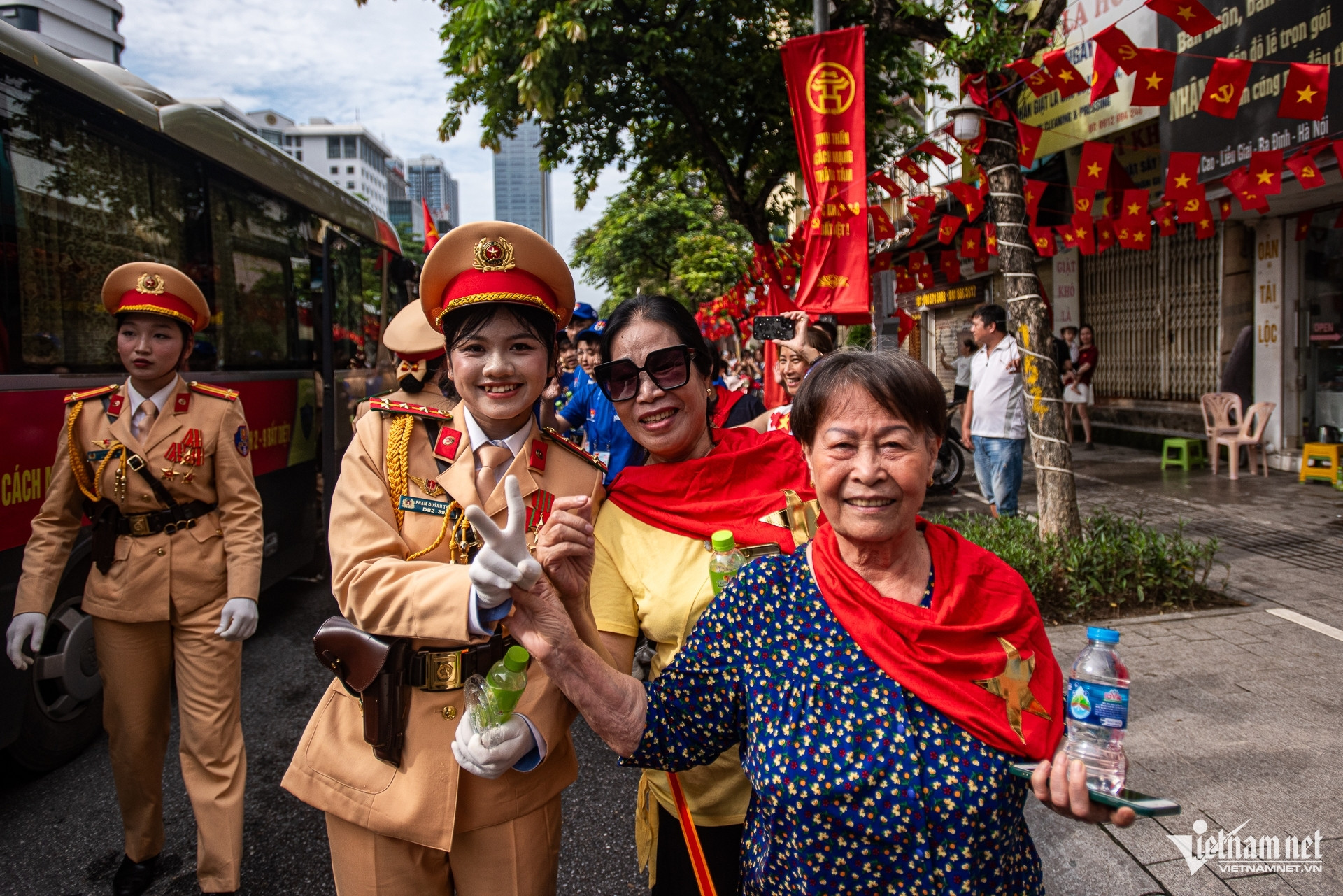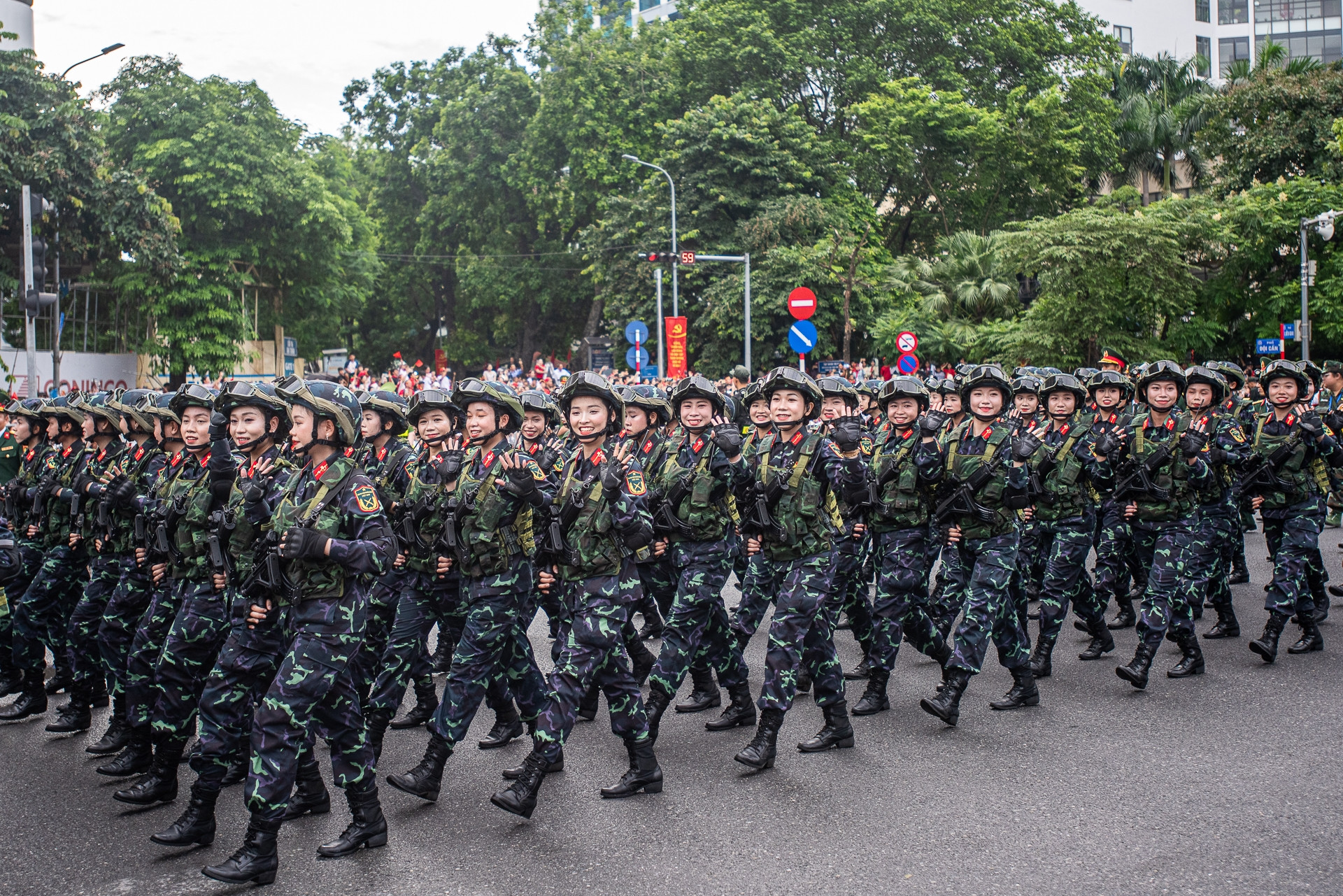 Bầu không khí hào hùng, náo nhiệt lại rộn lên mỗi khi có đội hình diễu binh đi qua ngã tư Văn Cao - Liễu Giai. Hàng nghìn người hò reo chào đón các chiến sĩ.
