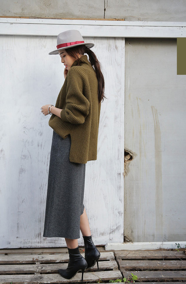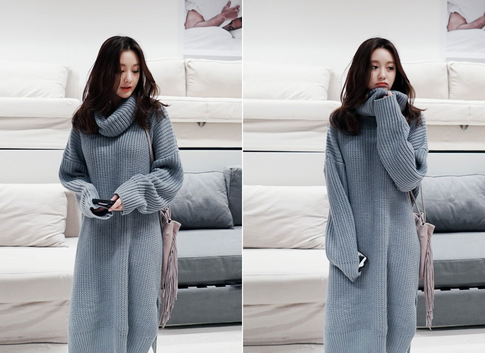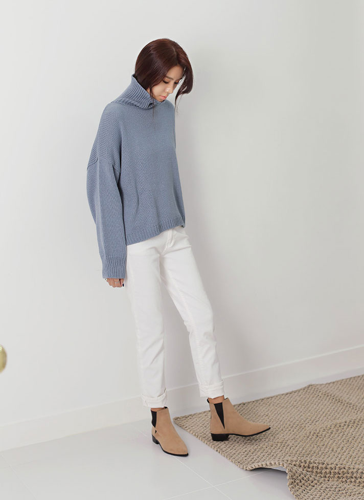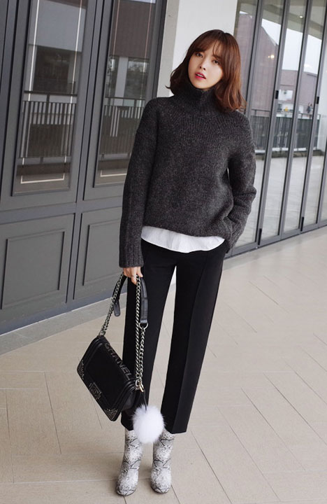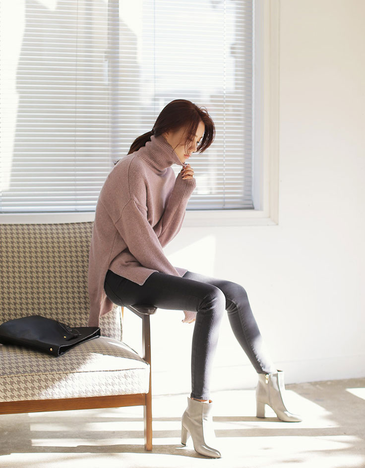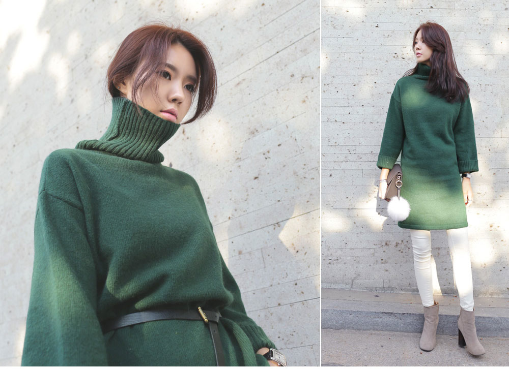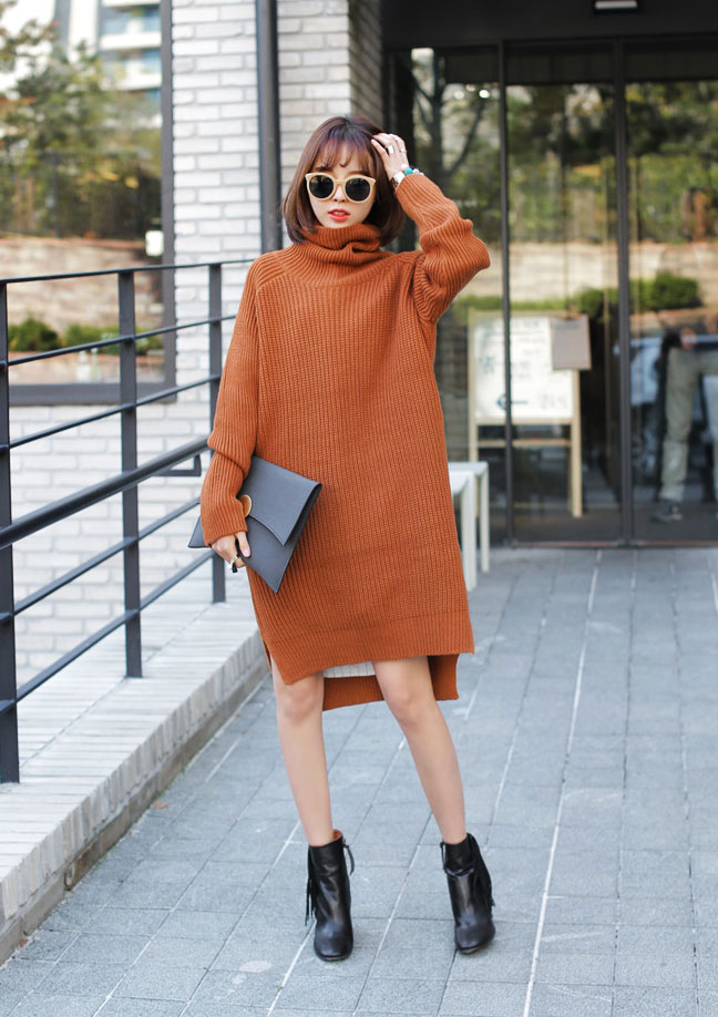 Phong cách trẻ trung nhưng không kém phần gợi cảm bằng cách kết hợp váy len cổ lọ oversize với bốt ngắn cổ