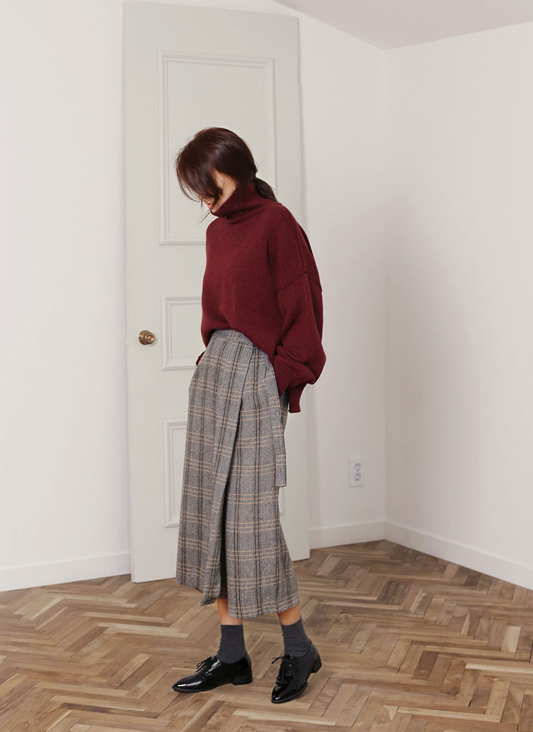 Áo len cổ lọ mix với kiểu quần âu ống rộng, ngắn ngang mắt cá chân mang lại sự phá cách cho bạn gái.